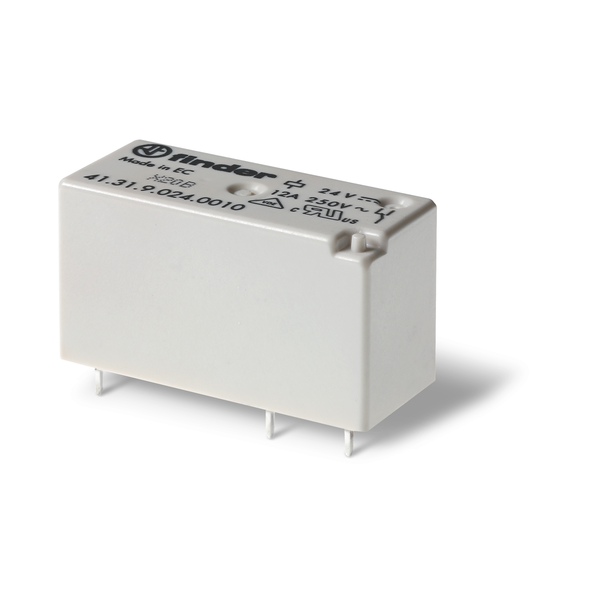 Type 41.31 Low profile PCB relays, 1 CO 12 A (3.5 mm pin pitch) for direct PCB mounting or with 93 and 95 Series sockets.