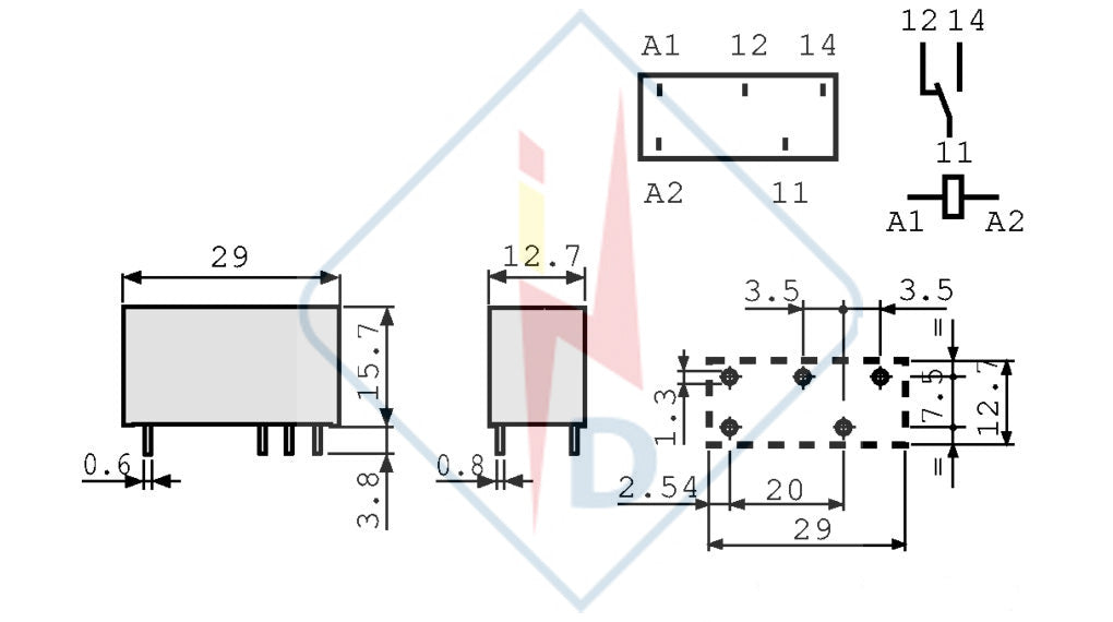 Low profile PCB relay 1 contact 12 A (3.5 mm pitch), suitable for mounting on PCB or 95 Series sockets. Equipped with AC or DC coil. 8 mm, 6 kV (1.2/50 μs) between coil and contacts. Cadmium-free contacts. Flux-proof: RT II standard, (also available in RT III version).