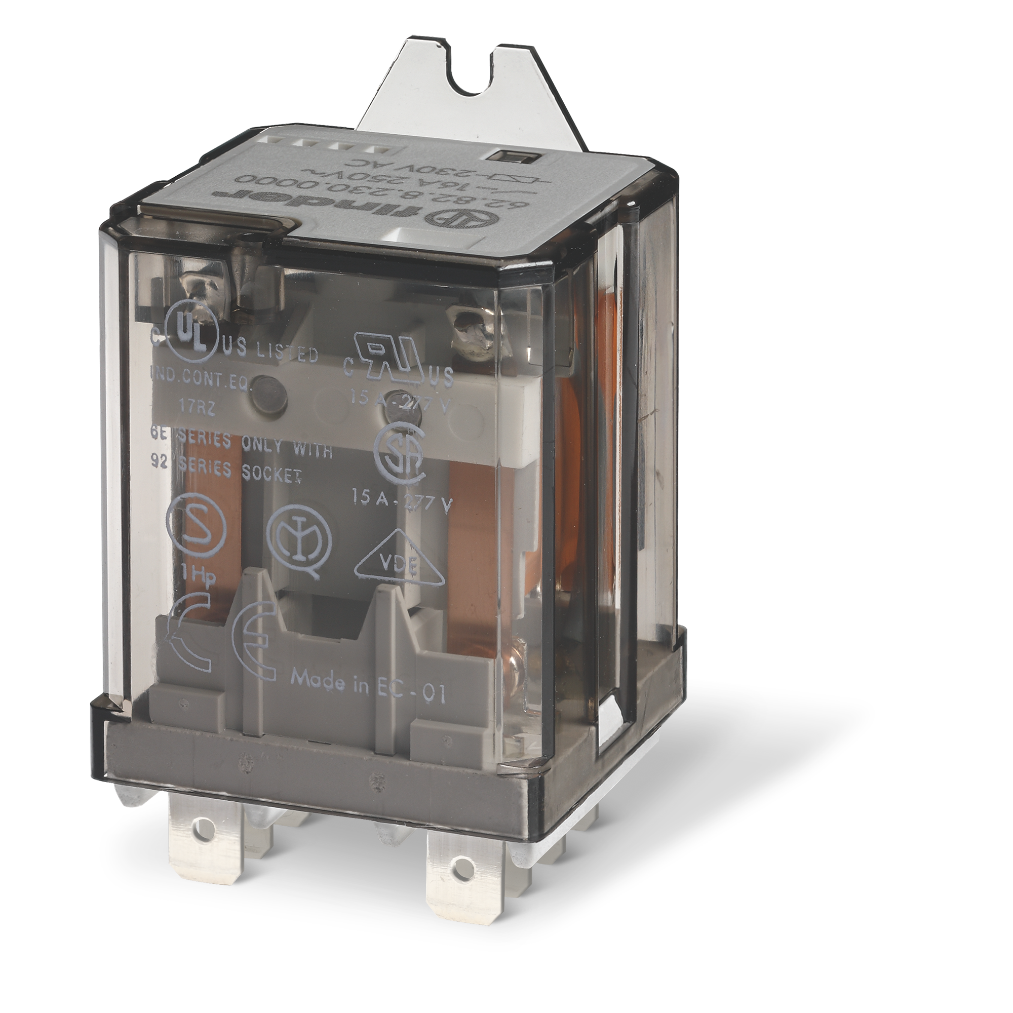 Type 62.82 power relay with 2 pole changeover contacts and 250 Faston (6.3 x 0.8 mm) connections. Flange or optional mounting adaptors.