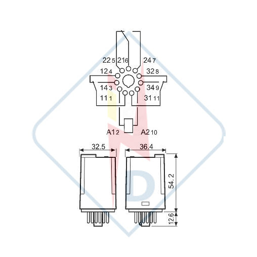 General purpose industrial relay, 3 pole 10 A contacts, 11 pin plug-in.