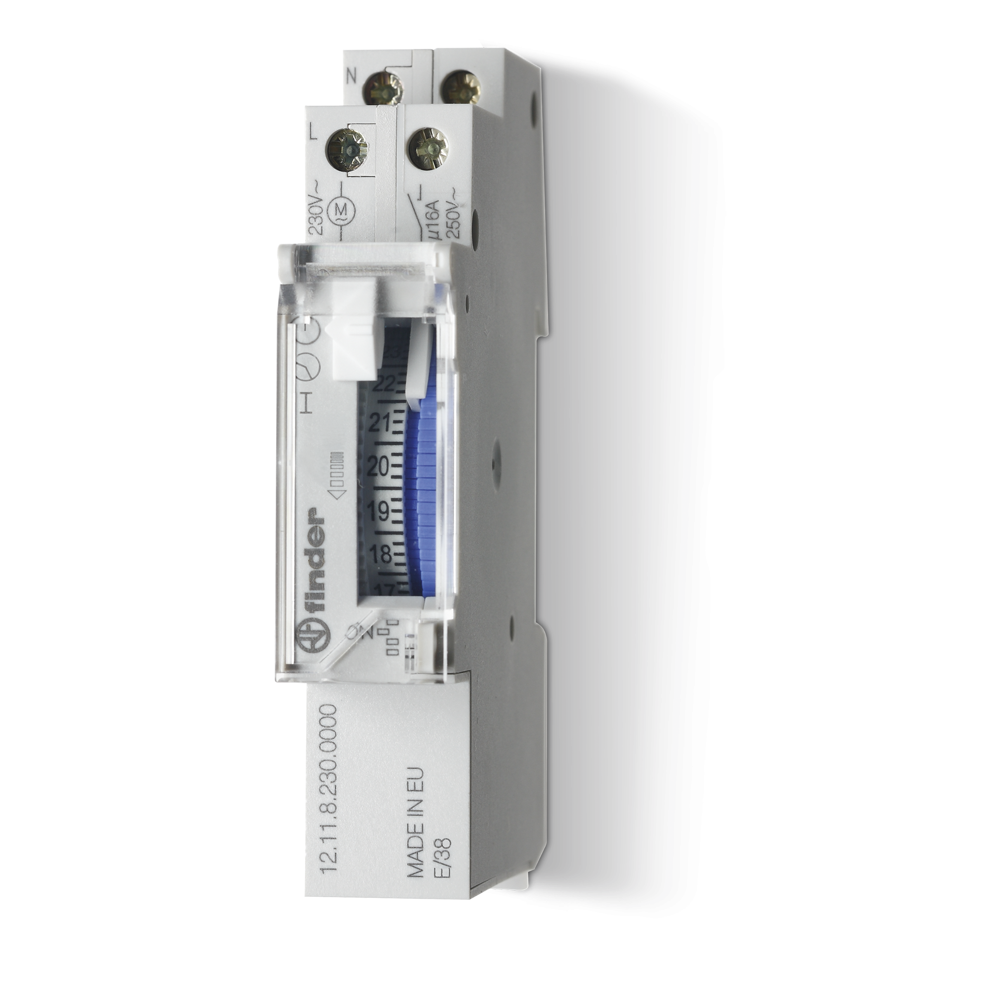 Type 12.11 Mechanical time switches , daily with 1 NO 16 A contact, Width 17.6 mm. 35 mm rail (EN 60715) mounting.