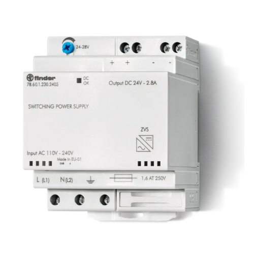 Type 78.60 60 W high efficiency, low profile modular DC power supply for electrical cabinets with ZVS (Zero-voltage-switching), quasi-resonant mode switching.